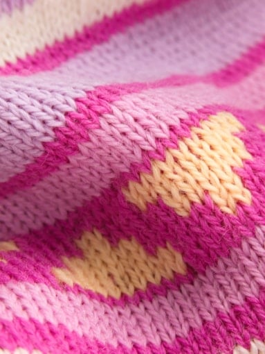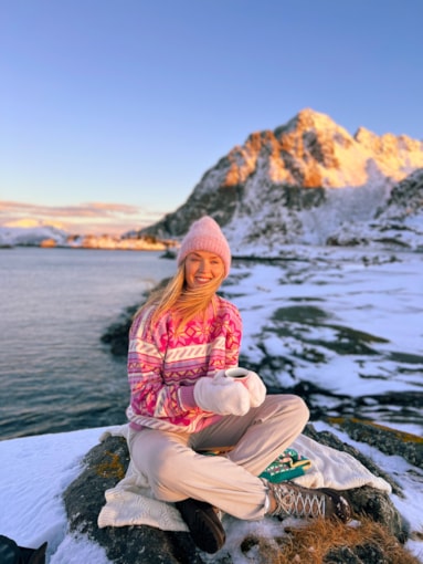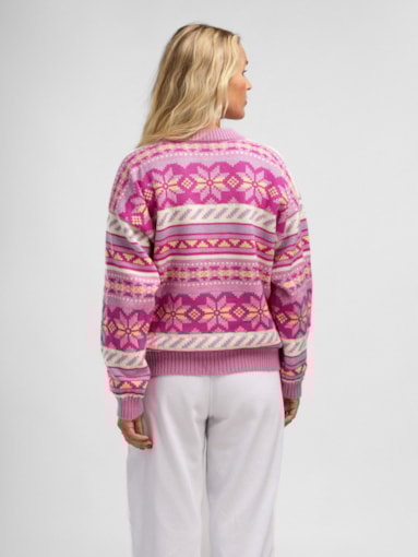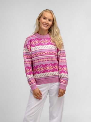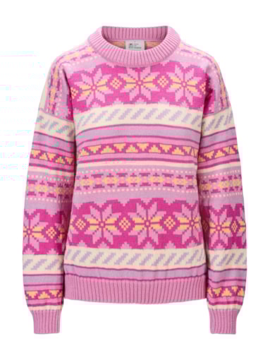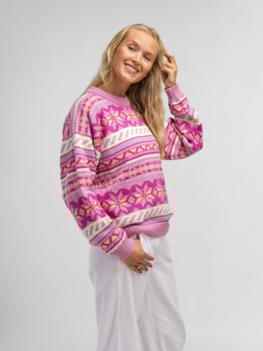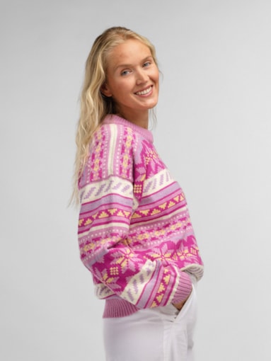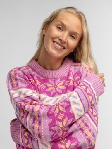 En fargeglad og stormønstret ullgenser inspirert av Lofotens spektakulære solnedganger og snøkledde fjell. Genseren er laget i 100% myk merino-ull og er utviklet i samarbeid med den turglade influensen Ingrid Raadin Hennig. Hun tilbringer mye tid ute i Lofotens majestetiske natur, og ønsket å utvikle en behagelig og lett turgenser som reflekterer de naturlige pastellfargene i de utrolige omgivelsene. De dekorative, forstørrede designelementene består av den klassiske norske åttebladrosen og lusemønsteret fra setesdalgenseren. Resultatet er en lett, myk og komfortabel genser med avslappet passform og en fargepalett til å bli glad av. En fargeglad turkamerat som trives like godt på fjellet som i byen. - Passform: Boxy passform med dropped shoulder