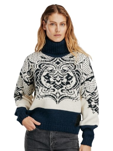 Blomdalen er en myk og luksuriøs genser, strikket med løst spunnet garn i en 50/50-blanding av alpakka og ull. Blomstermønsteret er basert på tradisjonelle Dalemønstre. Genseren har en oppdatert, boxy passform, en myk høy hals, og lett ballongformede ermer.