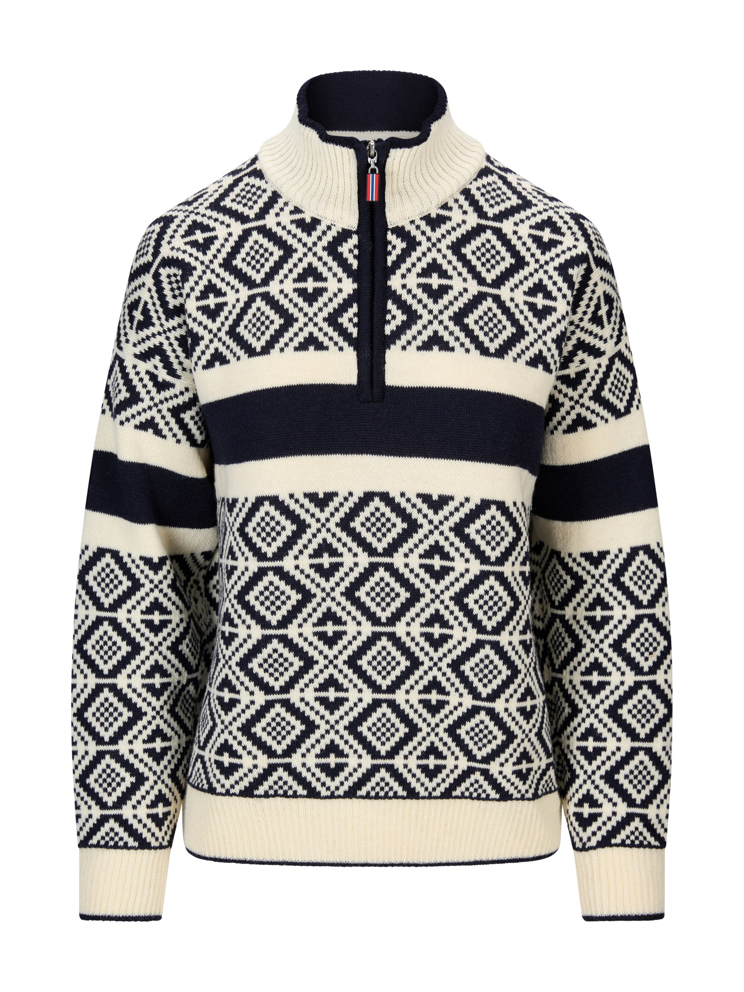 Dette er en ny og sporty genser, inspirert av den første offisielle OL-genseren fra Dale of Norway, Cortina 1956. Genseren har høy hals med glidelås og en behagelig passform som gjør den til det perfekte mellomlaget.