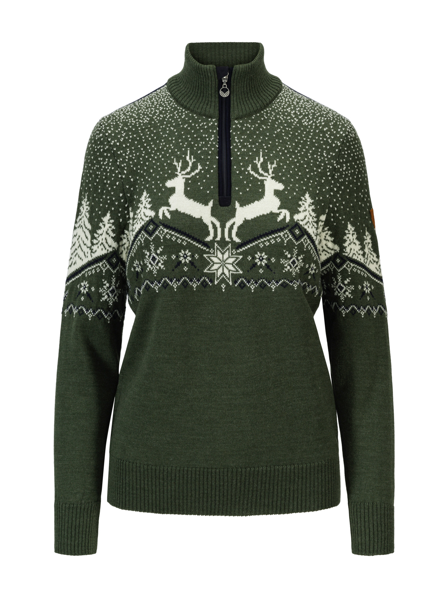 En klassisk julegenser med mønster inspirert av norsk jul, med reinsdyr, juletre, fallende snø, og sentrert i front: en tradisjonell åttebladrose. Genseren er laget i 100% myk og lett merino-ull, med høy hals og glidelås. Ullgenseren kan brukes både som en julegenser og som en ski-/afterski-genser.
