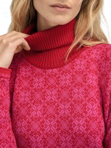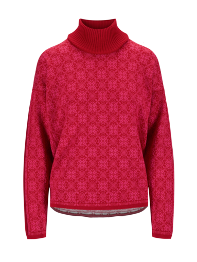 • Dette er en avslappet, høyhalset ullgenser med en oppdatert og vid passform. Genseren har en noe lenger rygg enn front. Det heldekkende mønsteret er uendret, bestående av en avrundet variant av den tradisjonelle åttebladrosen.