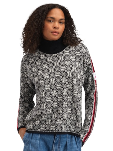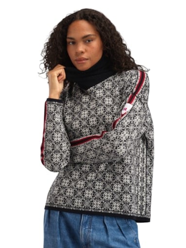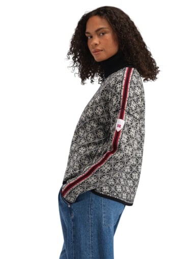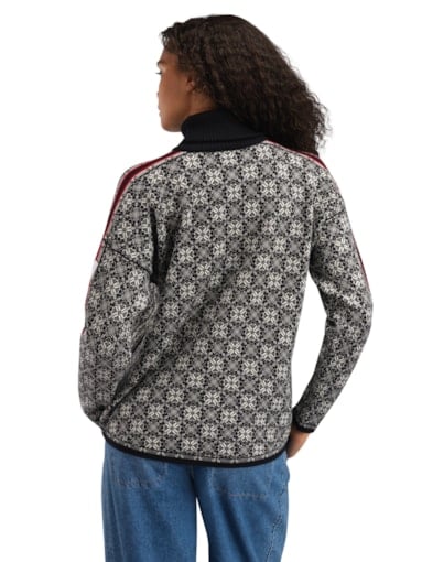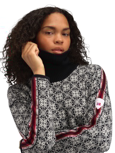 Dette er en avslappet, høyhalset ullgenser med en oppdatert og vid passform. Genseren har en noe lenger rygg enn front. Det heldekkende mønsteret er uendret, bestående av en avrundet variant av den tradisjonelle åttebladrosen.