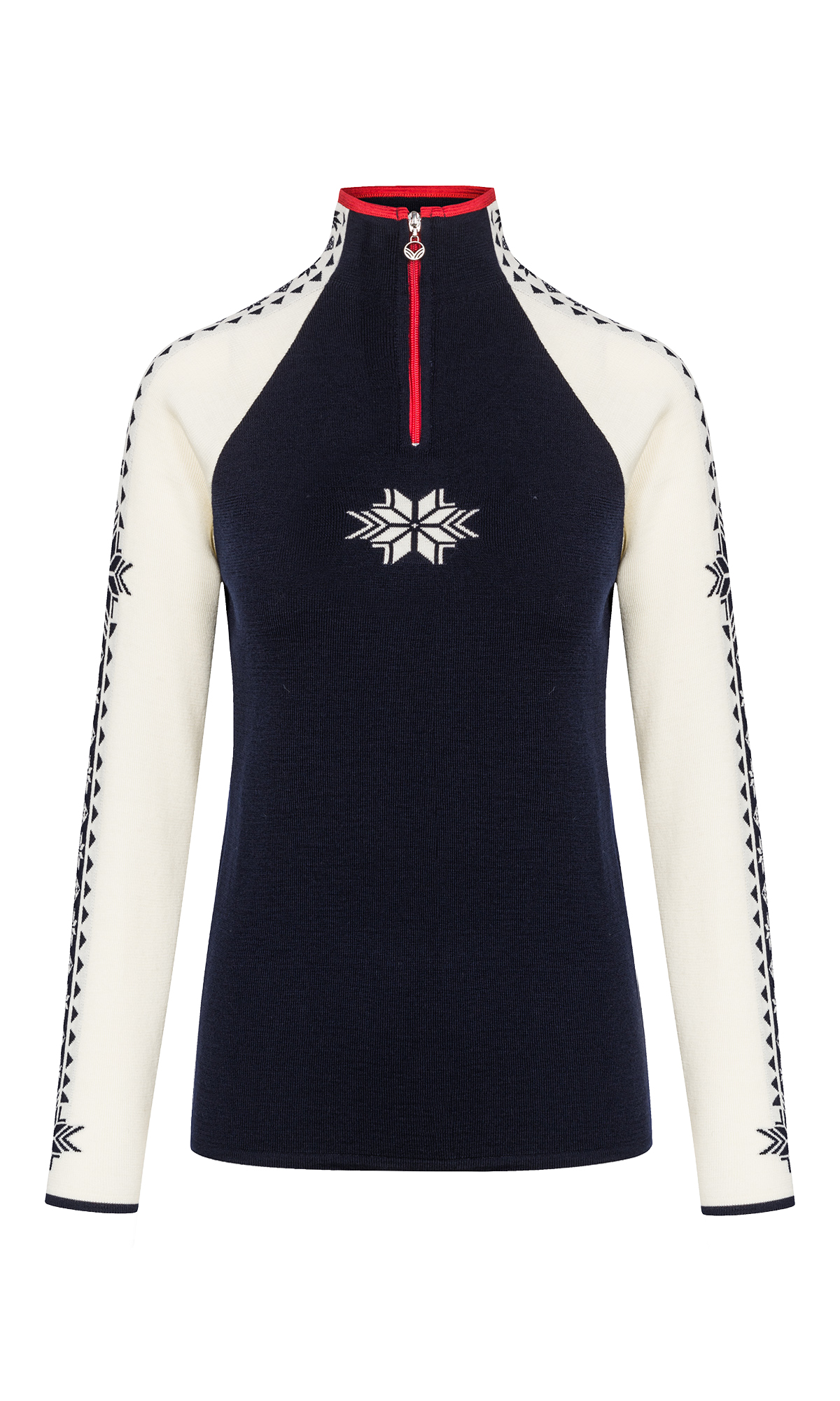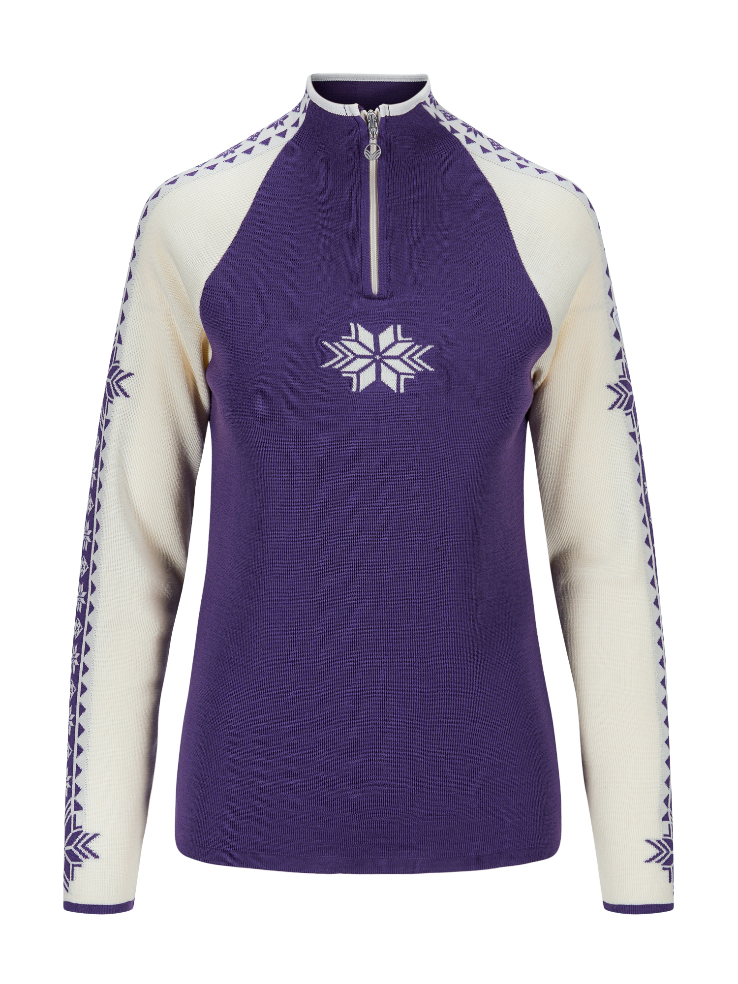 En sporty ullgenser i 100% lett og myk merino-ull. Genseren er ribbestrikket med ekstra stretch, og egner seg både som mellomlag ved utendørs aktiviteter og til daglig bruk. Genseren har en praktisk halvhøy hals med glidelås. Langs ermene går et mønster av åttebladroser og en stor åttebladrose er strikket inn på brystet. Noen av fargevariantene har ermer med reverserte farger.