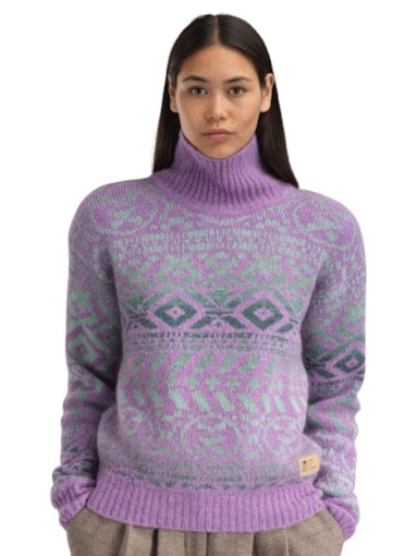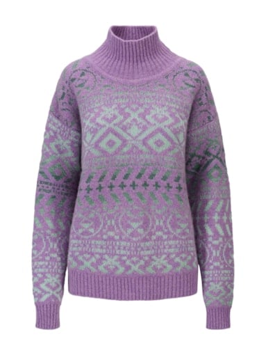 Historisk design og leken eleganse møtes i et sukkerspinn av en genser med høy hals og avslappet passform. Det er en lekenhet i både fargevalg og tekstur. Det luftige og luksuriøse alpakkagarnet danner en ensfarget base. Mønsteret er strikket i et bomullsgarn med ombré-effekt, der hver bomullstråd har graderte farger. Dette garnet har også en flatere struktur. Sammen gir dette både kontrast og dybde, noe som gjør Highland til en genser som står ut i mengden. Den myke og komfortable genseren er designet i Norge og produsert i Italia. - Størrelser: XS – XL