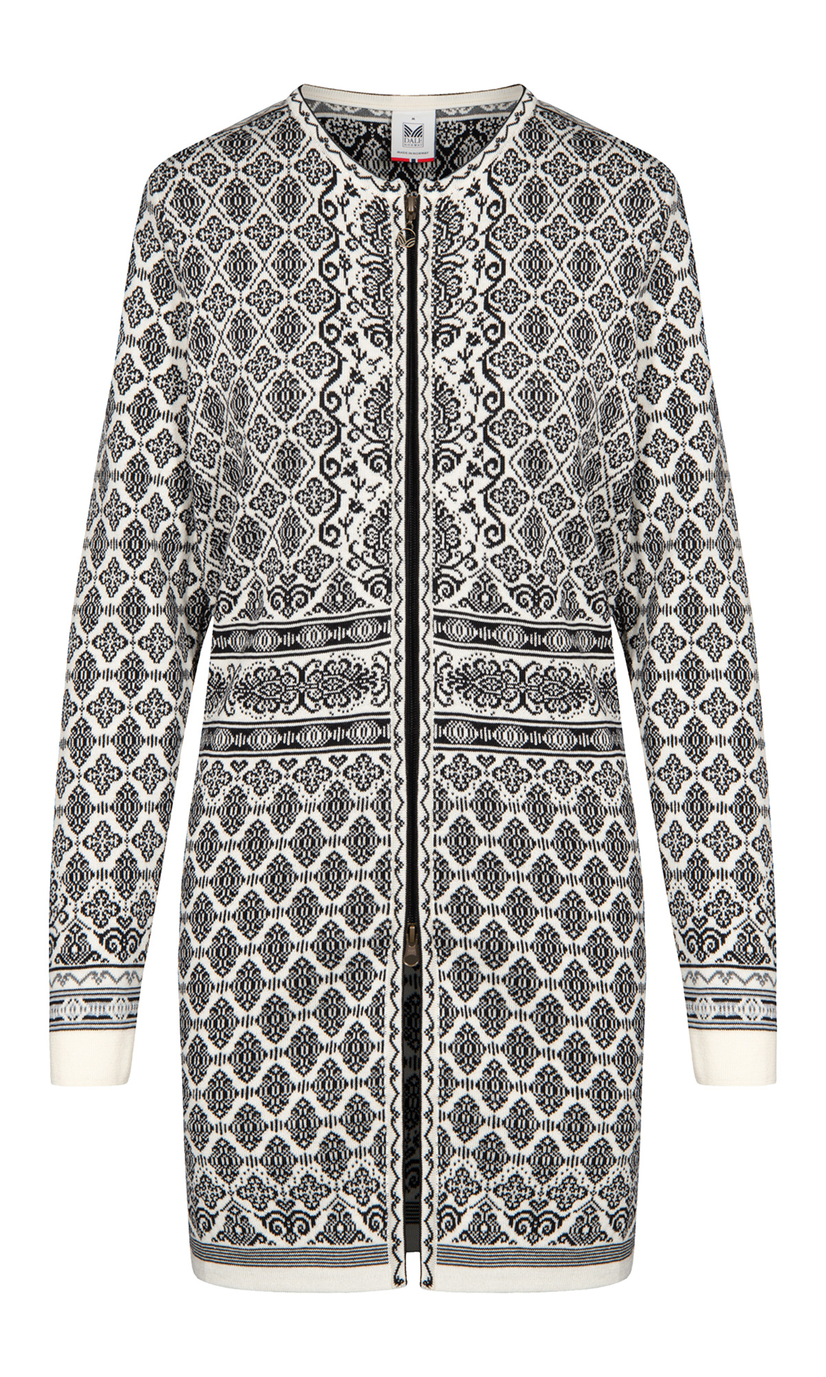 En lang og komfortabel ulljakke. Detaljerte mønstre og splitter i sidene tilfører akkurat passe mengder femininitet til denne elegante jakken. Strikket i 100% myk og lett merino-ull i svært holdbar kvalitet.