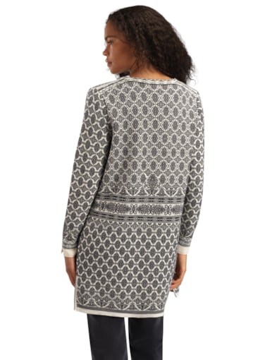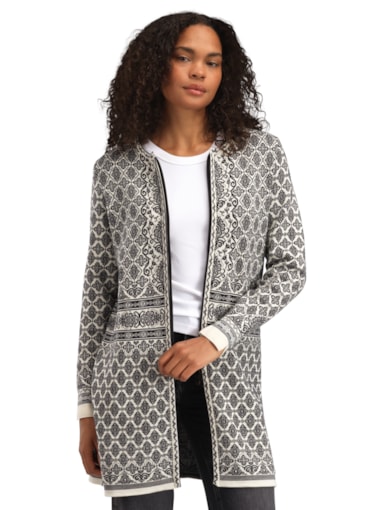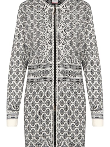 En lang og komfortabel ulljakke. Detaljerte mønstre og splitter i sidene tilfører akkurat passe mengder femininitet til denne elegante jakken. Strikket i 100% myk og lett merino-ull i svært holdbar kvalitet.