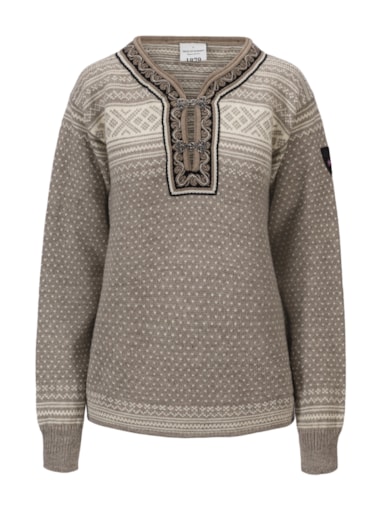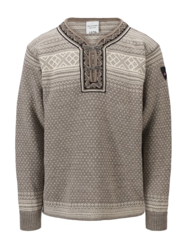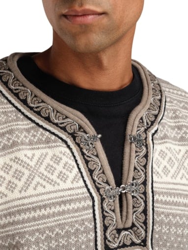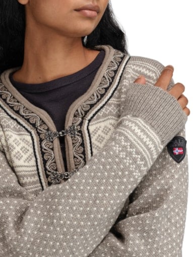 Setesdalsdesignet er et av Norges mest kjente mønster. Dette er den originale lusekoften, strikket i 100% norsk ull, med tinnhekter og vevde bånd laget i Norge. Ullgenseren har det velkjente lusemønsteret og de tradisjonelle korsene, som opprinnelig ble strikket inn for å beskytte mot onde ånder.