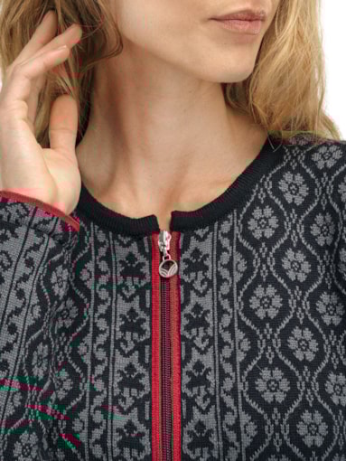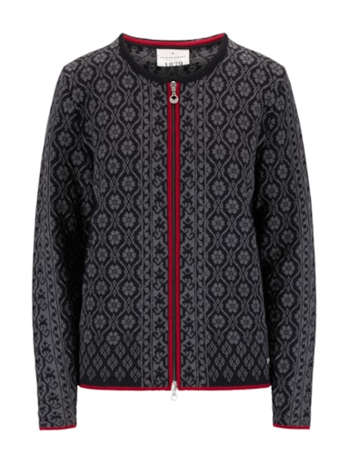 En lett og detaljrik ulljakke med smal passform og sidepanel med flatterende innsving. Rosemønsteret er inspirert av en variant av trønderbunaden. Jakken har toveis glidelås og er strikket i 100% myk merino-ull.