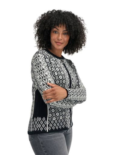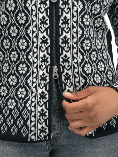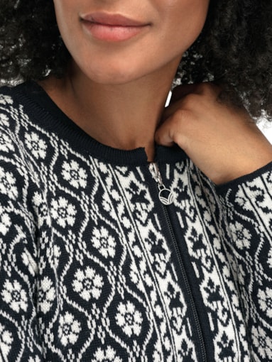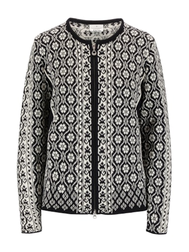 En lett og detaljrik ulljakke med smal passform og sidepanel med flatterende innsving. Rosemønsteret er inspirert av en variant av trønderbunaden. Jakken har toveis glidelås og er strikket i 100% myk merino-ull.