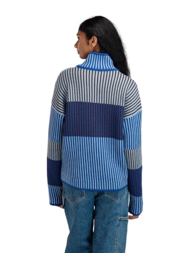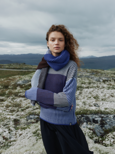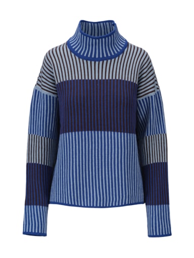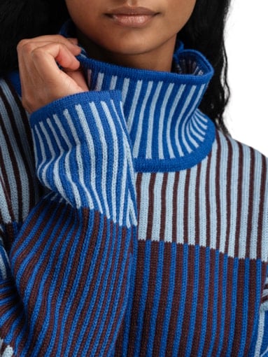 • En sofistikert ullgenser med senkede skuldre og en avslappet, romslig passform. Genseren er strikket i dempede kontrastfarger med struktureffekt. Til tross for sitt oppdelte uttrykk, er genserens fremside, bakside og ermer strikket i hele stykker. Den romslige høye halsens strikkede struktur gjør at den enkelt holder seg pent oppe.