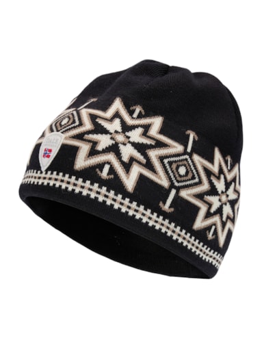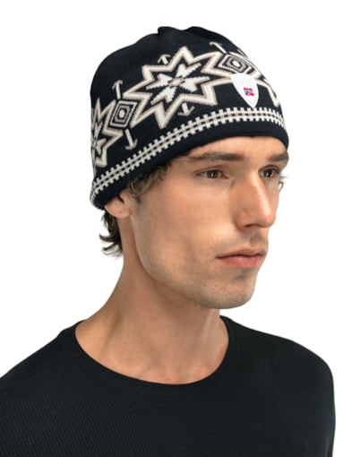 • En sporty lue laget av 100% myk merino-ull. Med designpåvirkning fra vår OL-genser fra 1976, hinter de store, bearbeidede åttebladrosene til snøkrystaller og vinterstjerner.