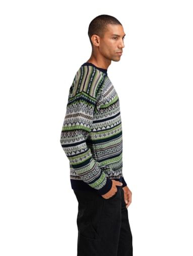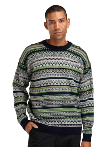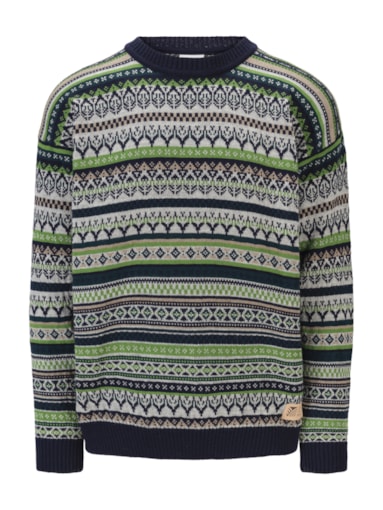En leken, detaljert og helmønstret ullgenser med avslappet passform og rund hals. Genseren er strikket i 100% ull med lang holdbarhet. Mønsteret er en miks av historiske Dale-mønstre.